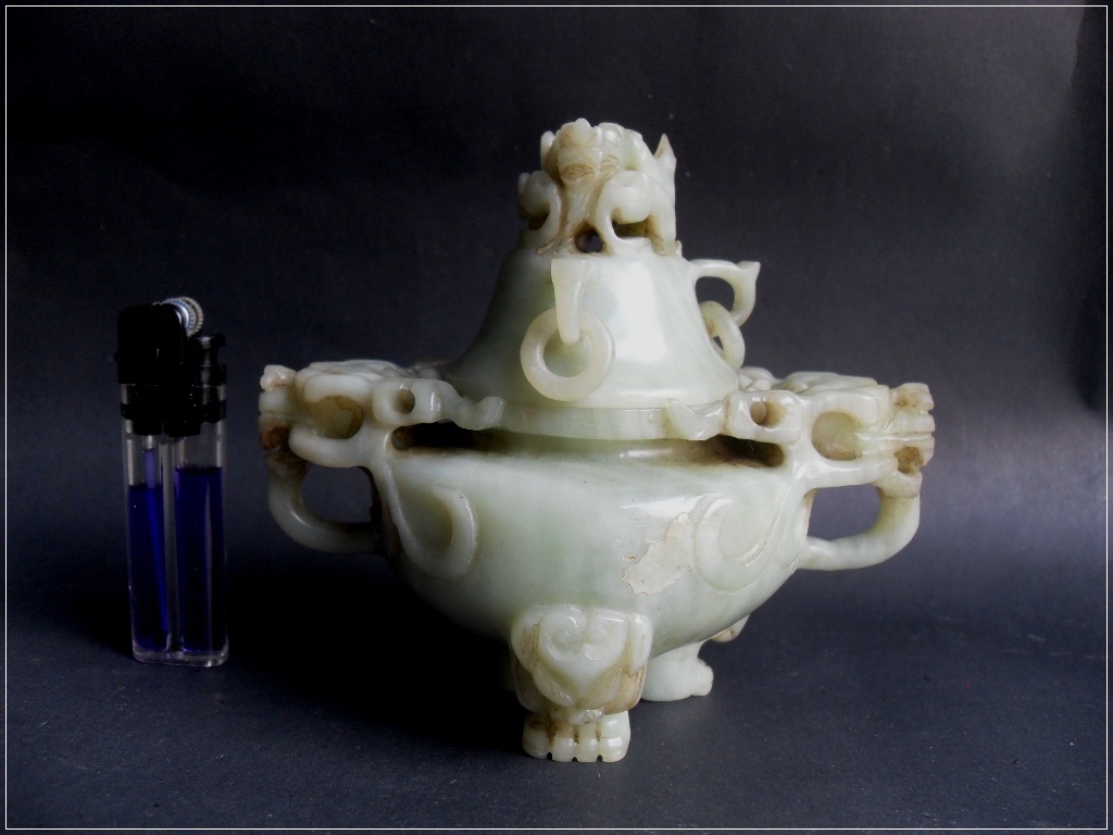 Tempat Dupa Batu Giok dengan motif kepala Naga, dengan tiga buah kaki ,Canting yang ber cin-cin di tutup-nya dua buah. Tinggi tempat Dupa ini 13-cm , dengan berat sekitar 650 grm. Masih relative baik, tak ada Cuil.